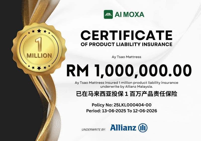 为了让大家使用得更加安心,我们的小艾床垫已在马来西亚投保 RM 1,000,000 产品责任保险
